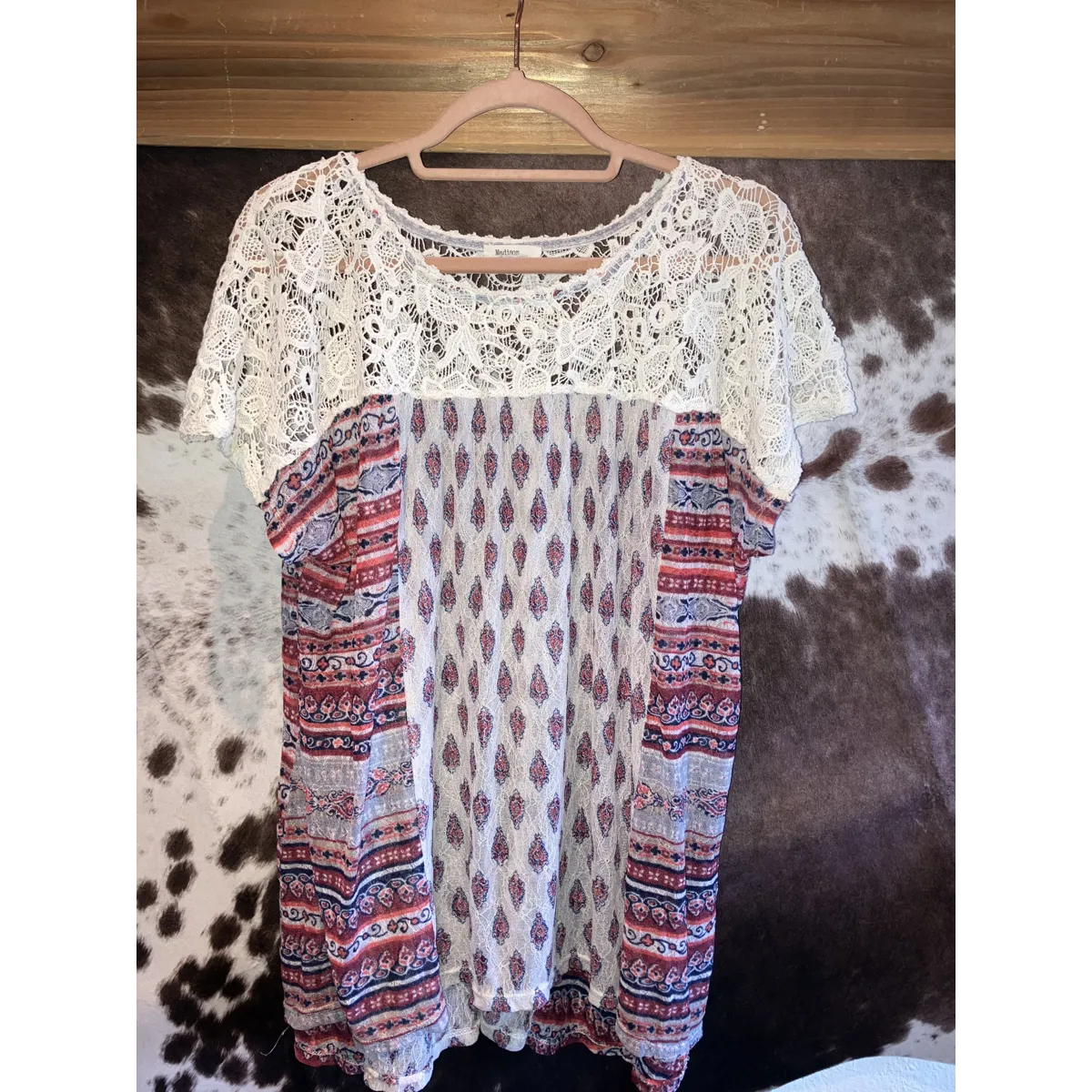 Sheer print & lace boho top. Size 1X